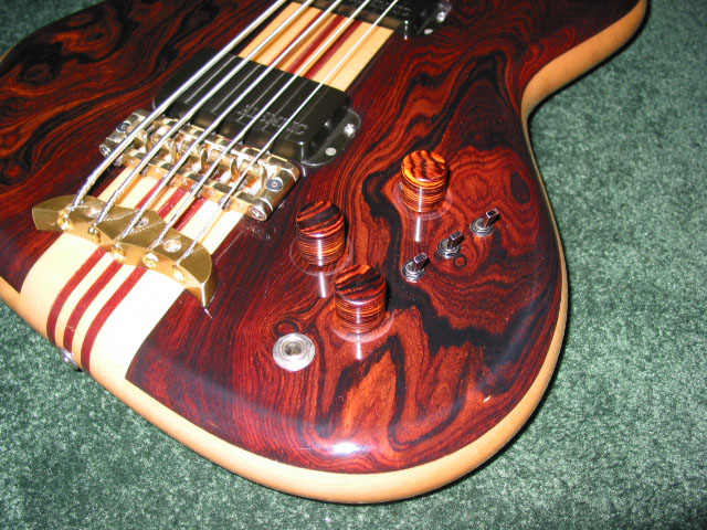 I bought this beautiful Cocobolo Elan 5 from Tim Sarter about a month ago. A friend who makes custom guitar knobs made the knobs from cocobolo I selected. Click the link below to visit his website: