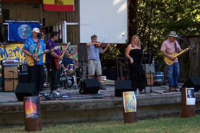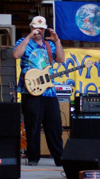 Well, it was quite a gig - one I shall NEVER forget!   My wife & I drove up Friday night and stayed in a hotel in Santa Rosa.  On the way we stopped at McDonalds and about an hour later I started feeling bad.  Food poisoning!  A very rough night and I was barely able to pack up and head to the gig by around noon the next day.  We got there and found out they were behind schedule because they couldn't find the power adapter for the PA board and had to borrow another board.  I passed out ten minutes before I had to go onstage.  I somehow managed to make it - the show must go on and all that stuff.  Our drummer then discovered that he had forgotten to bring the power adapter for his electronic drums!  (Does anyone sense a theme here?)  We quickly took his set down and set up a borrowed acoustic set.  During our third song, the PA blew a breaker so we went instrumental with the back line only and pulled out La - the second (usually piano) part of Layla.  We played about 1.5 hours with the PA crapping out a couple of times more.  Even with the problems it was a fun gig - good appreciative crowd.  I alternated between my Electrum, a PRS CE24 and a Ricky 360/12.  When we finished, the next band - sort of rock/jazz - asked me to sit in with them.  I played my Alembic and really got some nice Santana-like soaring tones.  Their bass player was drooling over my Electrum and told me he's saving up for an Alembic.  I, of course, told him what a great idea it was.  Quicksilver Gold was a lot of fun - all the old QMS material.  Here's a pic of Stonetrout: