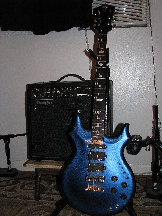 Hi Evan. I play my Alembic Trbute through a Mesa Boogie Mark IV. Lots of sustain, and natural tube distortion. It sounds great....