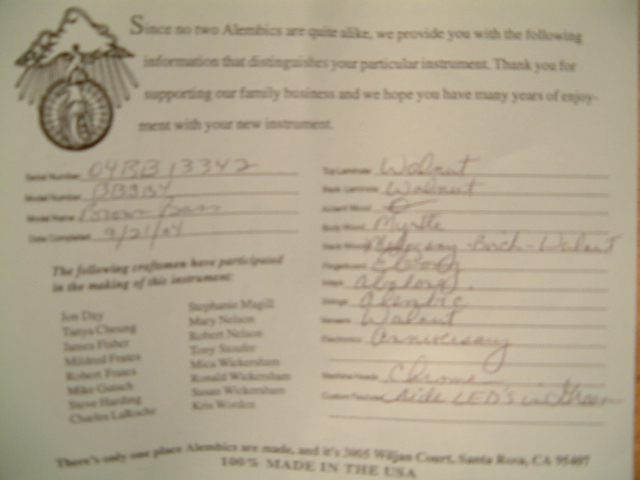 It is walnut/myrtle with green LED's, abalone inlays, chrome Gotohs, silver logo, OHSC and is pristine. The only difference I can see is it's an '05 so the LED toggle is moved up above (below?) the tone pots; otherwise, they are twins.