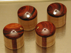 I have a set of knobs here that was constructed for an Alembic before the design was changed.  Since these knobs are no longer needed, I am offering them for sale here.  They are constructed of Flame Maple with a Purpleheart vertical laminate capped by Cocobolo.  The position markers are 22k solid gold.