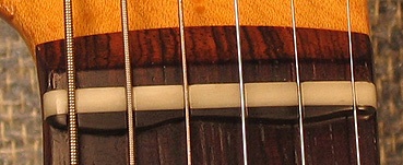 If I have a point, it's this - there simply are much more important factors, and effective adjustments, starting with an obvious one that gets overlooked a lot. Here's a little homily from the workbench of my cussin' cuzzin' Cletus D. Hack. Mandolins (close relative of cursed lute) have four pairs of strings, each course tuned in unison. Guess what happens when the nut slots of one course are a couple thousandths off matching each other? Your brain will say wow, this thing sucks, it won't play in tune at all. But why? The strings are perfectly in tune, the bridge is perfectly placed, so that the octave harmonic is dead-on, or so sayeth the chromatic tuner. What's the x-factor? Having to press one of those strings down further to get that clean note, whether it's on the first fret or the next, makes it note sharper. Whether it's a guitar, mandolin, or a lute, (or even an Alembic bass) the nut slots have to be cut so that the bottom of the strings barely clear the top of the first fret. Too low and it rattles, too high and it intonates sharp.