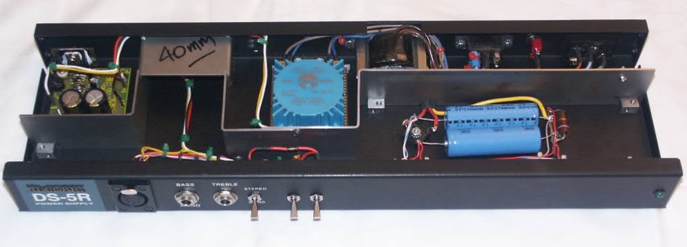 The blue thing in the centre is actually a small toroidal mains transformer. It is wired into the stock mains voltage selector switch, so the modified  DS-5R retains its ability to run from either 100-120 or 220-240 volt mains. The board to the left is the rectifier, filter and regulator circuit. The output is via an isolated 3.5 mm jack on the back panel just outside of the tunnel section of the shield.