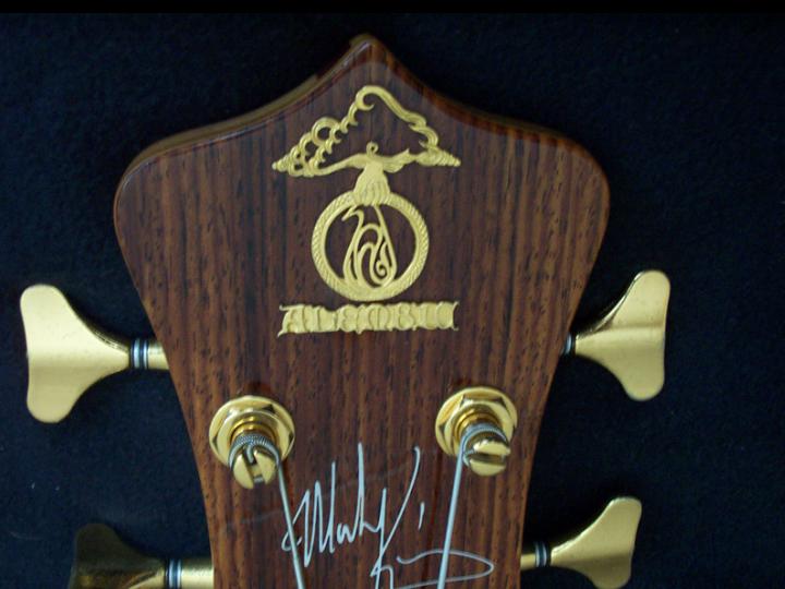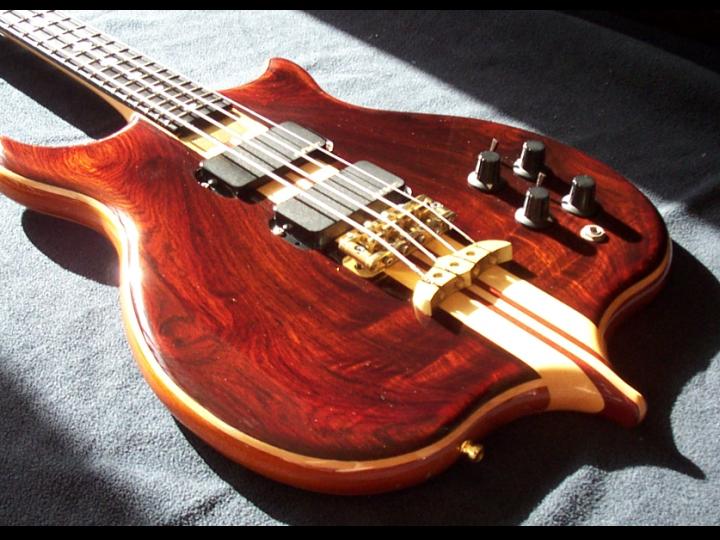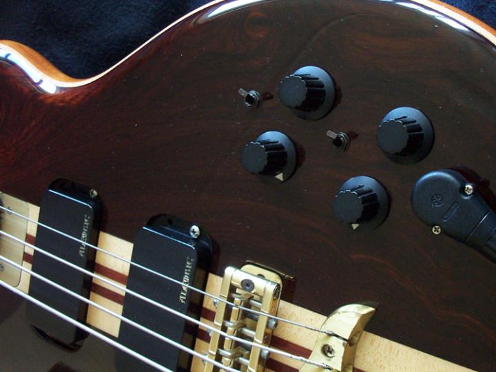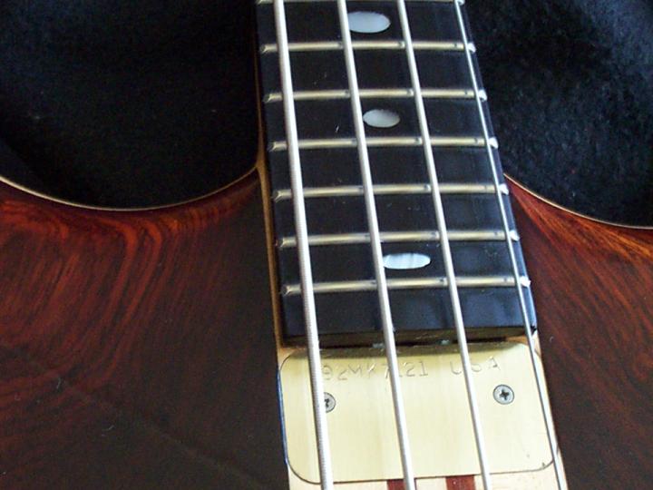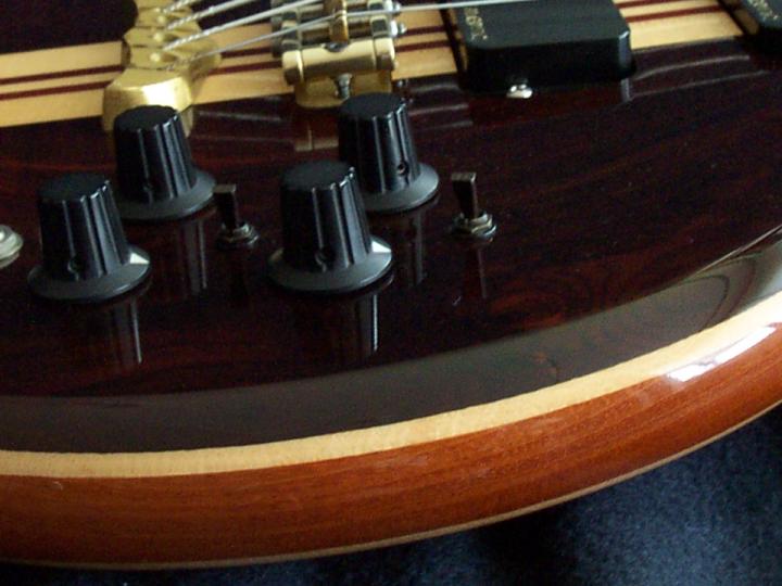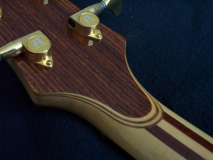 At the moment I use the lightest Elixir strings by Gore, gauges 40-60-75-95. I was looking for a good sounding, light string that keep a clear tone for a long period of time. You may know the Elixir strings for having a Polyweb coating, which protects the string from getting dull en lifeless because of gunk and goo that cause contamination and corrosion. They just last and last. These are the lightest Elixir had to offer. I had to compromise between durablity of strings and my preference for (very) light strings.