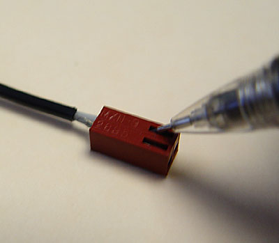 You need to insert the pencil in both slits, and gently pull the wire out. You might have to pull a little on one side, then on the other as you use the pencil.   Appearance of the crimps: