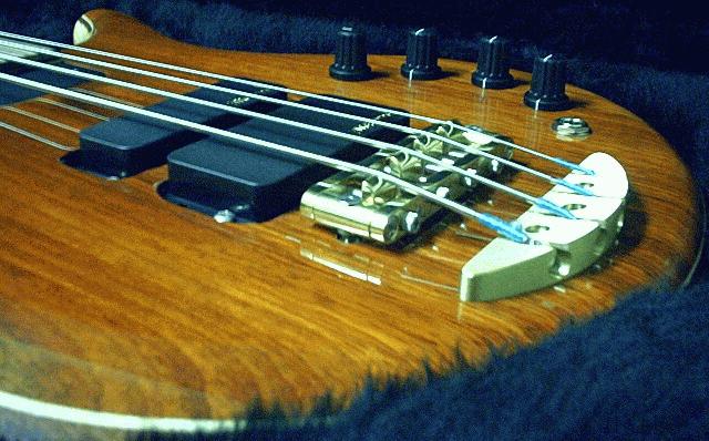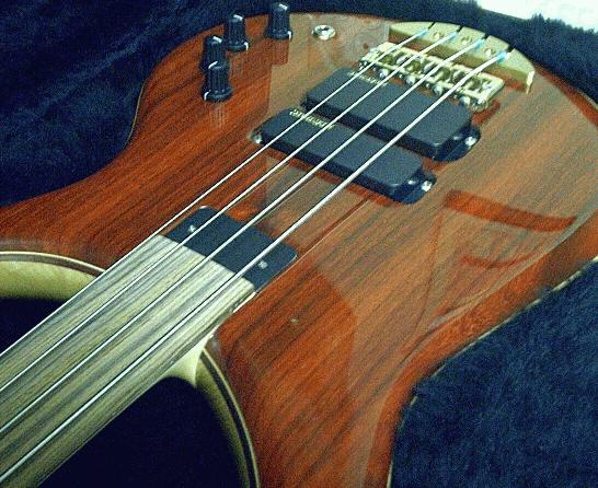 Well, I DID just play it for a few minutes thru headphones.  I am happy to report that the unmistakable tone I was anticipating is VERY evident.  I can't really crank it up until my downstairs neighbor leaves for work (hope he's not off today).  It appears, of course, that it may need some tweeking after shipment.  However, I will give it the obligatory few days to settle before attempting any neck adjustments.  Especially given the recent weather here (I believe the weather-guessers said it has been the second wettest June on record).  The action is great at the nut, but a little high in the middle.  Plus, when sighting down the neck, its looks a bit curvy.  I also need to decide on what to do about strings, cuz if i'm gonna tweek the neck, I might as well put different (lighter) strings on it first.  Here's another shot across the front...