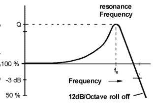 The signal from the strings is represented by the little circle with the wave inside and the PU is represented by its Inductance L, its Resistance R and the Capacity C between the windings. Ok, now that you now what is the equivalent circuit of the PU what can you do with it ? The signal from the strings in the above picture is considered as ideal which means that there is no distortion, no filtering or whatever. But this signal is only theorethically available because we need a PU (with given R, L and C) to get the signal from the strings. So if you now the values of R, L and C in the circuit above, you can calculate how the PU affects the sound from the strings. Ok, ok I know there is much more which forms the sound but lets concentrate on the electrical characteristics of the PU. Ok, so how does it sound ? Any Inductance L also has a Resistance (called XL) which is dependant on the frequency of the signal voltage. It doubles each octave, e.g. the Resistance at 200Hz is twice the Resistance at 100Hz. And again at 400Hz its twice as large as at 200Hz. To express this in a compressed form technicians express this with logarithmic values called decibel or "dB". A value of 6dB per Octave simply means that "something" (in this case the Resistance of L) gets doubled if the signal frequency gets doubled too. If you see something like "minus 6dB per Octave" this means that something is half of its original value if the frequency is doubled. The capacitance C behaves exactly the opposite as an Inductance: it divides its Resistance (called XC) by two each time the frequency gets doubled. Pooh, much math, eh ? Don?t give up, we are almost there. Look at the circuit diagram again: The Inductance L and the Capacitance C form a voltage divider from the signal voltage (coming from the strings) to the output terminals of the PU. As the signal frequency inreases, the Resistance value of L gets larger and larger and the resistance value of C becomes smaller and smaller. This results in a voltage divider which is dependant by the frequency of the signal voltage e.g. by the frequency of the strings. In this case it acts like a low pass filter. Because the inductance L causes the output voltage to decrease by 6dB/Oct (divided by two with each freqeuncy doubling) and the capacitance C does the same as well you can simply add both which results in ? Correct, 12dB/Oct. It still a lowpass but the signal decreases twice as fast as a simple lowpass. Since there are two frequency dependant components (L and C) this is called a second-order low pass with 12dB/Octave roll off. Since the resistance of L increases with the frequency and the resistance of C decreases with the frequncy there must be a very special frequency when the resistance values of L and C are equal. This frequency is called resonance frequency (called f0). At this frequency the PU has its highest signal voltage output, it can even be larger than the input voltage ! (To understand how this is possible you need to get into complex number mathemathics but then I will be killed by all board members.) At the moment it?s enough to know that above the resonance frequency the output voltage of the PU will decrease by 12dB/Oktave e.g. gets quartered by frequency doubling. The filter curve of the PU now looks like this: