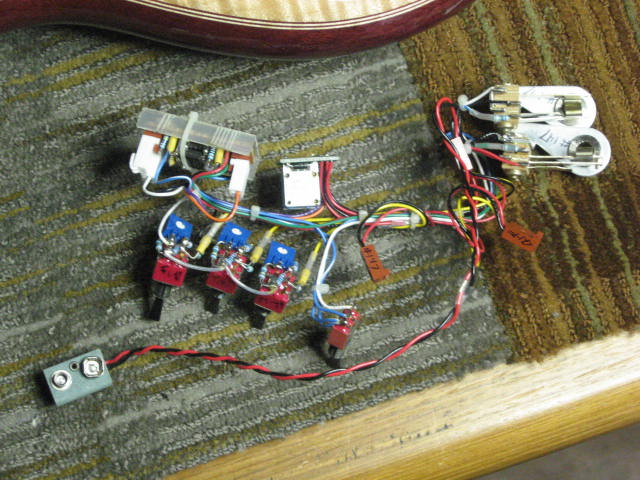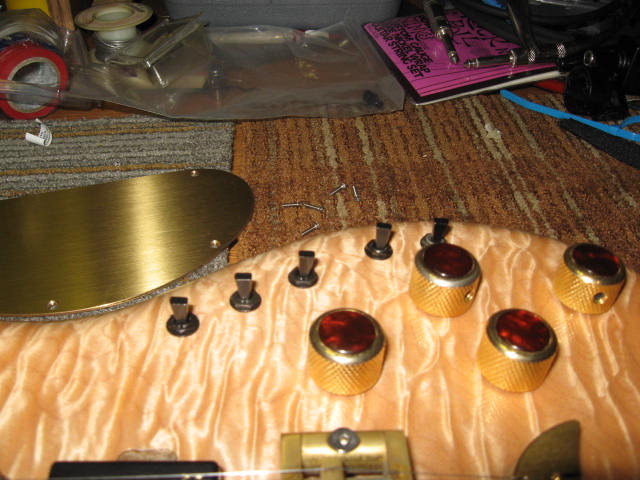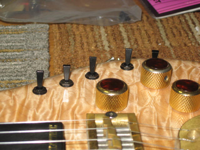 Since all the switches were out, I oriented them a little differently.  Previous to disassebly they were oriented following the curve of the body shape, and in the heat of performance I'd slip my hand down and find it difficult to tell which switch I was flipping.    When I re installed them, I reoriented them so they are parallel right angles with each other and switch straight up and down.  See pics..