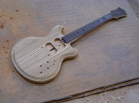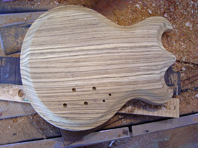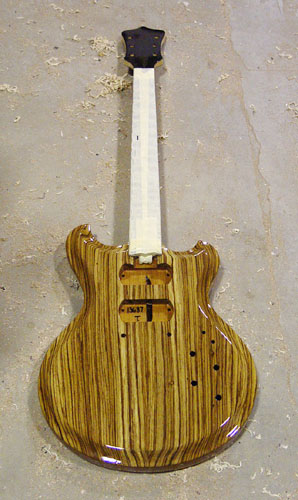 The hardware is brass with gold plated tuners. I think that will look just great with the warm color of the Zebrawood, which will of course get even more stunning once the finish hits it.