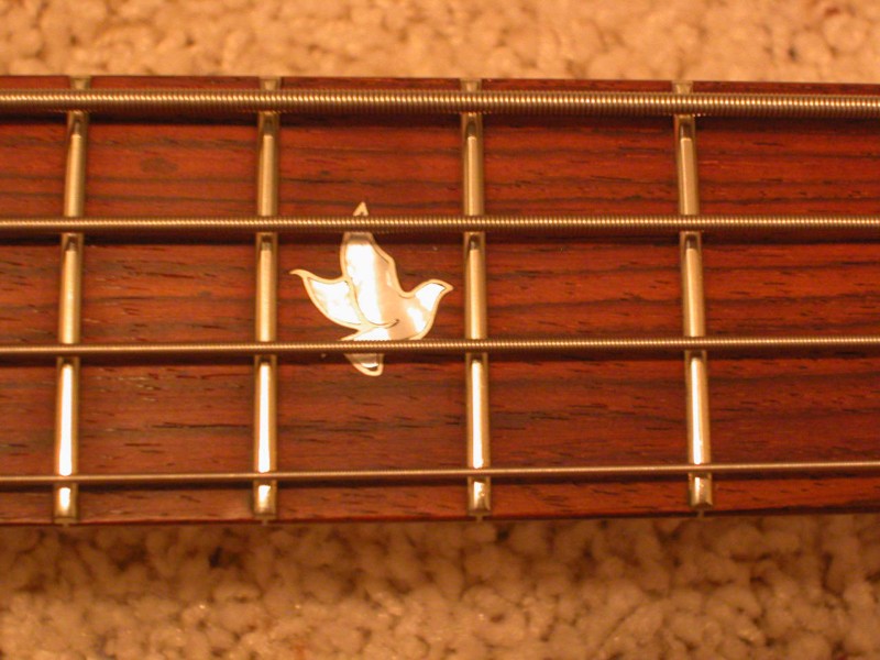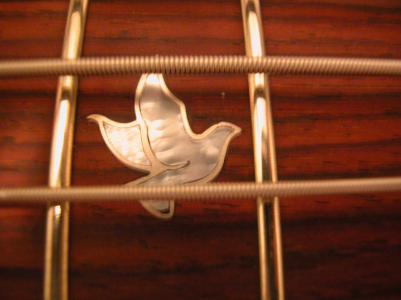 Randy:  I forgot all about that picture.  I remembered it as soon as I saw it.  Still curious how the dove looks framed by strings and frets, but I get the idea.  Very pretty and it definitely works to eliminate all other inlays on the cocobolo neck.  I like it a lot.