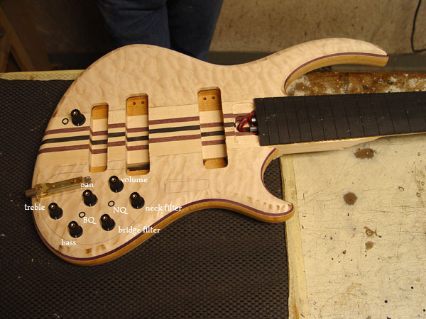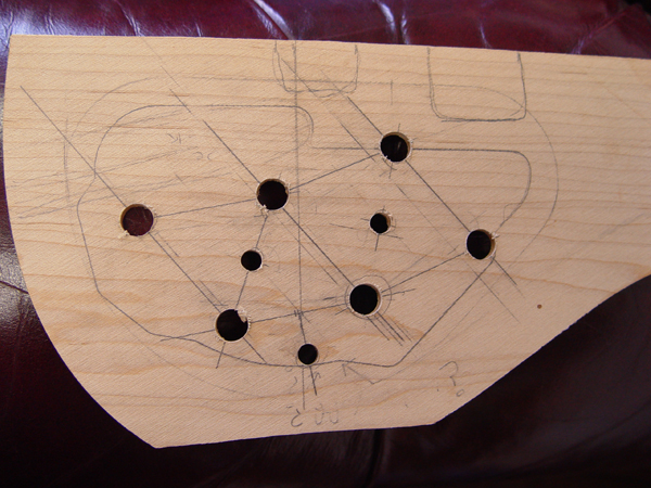 These aren't perfectly aligned, just placed for rough assessment. Obviously the extra knob and washer on the neck are not part of the scheme, just what I cut and paste for the other controls. The only slightly weird thing about getting the extra controls in is the jack placement. Normally, the jack would swing down about 30 degrees from this placement, but as you can see it takes up a good deal of space. Let me know if something like this looks good to you.