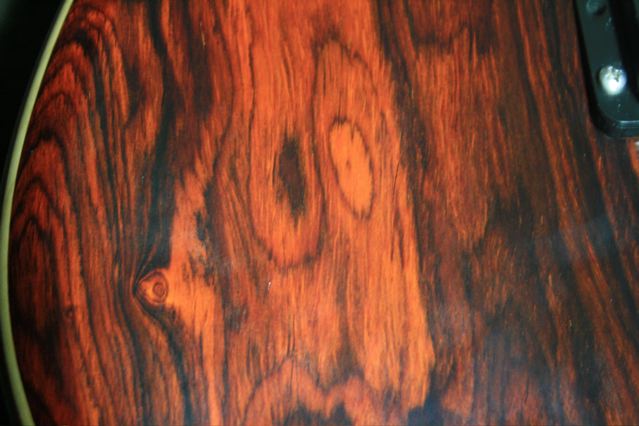 If you can't tell, It's a Coco Bolo top. Maple laminates and a Mahogany core. Maple neck with purpleheart laminates that are very very brown (which is cool, i'm not so into the purpleheart look). I believe the hardware is chrome plated. Series 1 electronics with a master volume. Sometime soon I'll try to get it in some natural light and take some better pictures, but the door to my back patio currently looks like this: