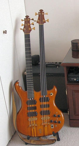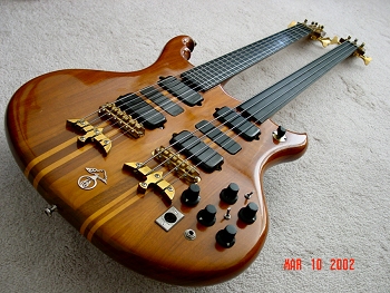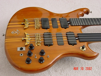 The instrument is setup just like any Series I.  The only addition is the extra knob right up by the bass neck?s tailpiece.  That?s a two-way selector for the two necks.  Like most Alembics, this guy is a sustain monster and without this toggle I?m sure it would generate lots of sympathetic string noise.  Actually, I?ve had some fun selecting one neck and then playing the other just to generate the resonant tones.  Just a little feature I?m sure didn?t make the functional specification.