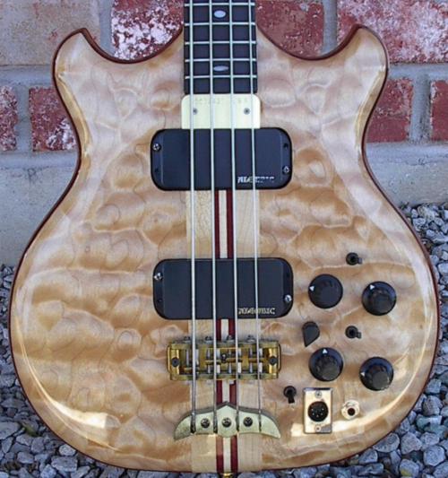 This is a bass that Alembic made custom for me. It was based on a combination of some of my Series basses and on a 20th Anniversary bass that I once owned. I liked the Anniversary bass, but it was just too big for me. I am so used to the small bodied basses. This bass was a Featured Custom from September of 2000. You can go to the archive and check it out. It really has some nice features.