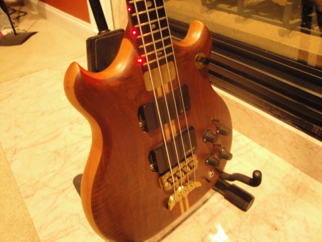 I got it today.  Whoever had it before me obviously didn't play it much: I can't find a scratch or ding anywhere.  The front and back are flamed Walnut and the contrast with the Myrtle body is really striking.  A nice surprise was the LEDs (I didn't know it had them until I took it out of the case).  The position markers (MOP?) are hypnotic.  The back laminate adds enough weight to the body so that it balances better than my SC.  The tone is not much different (which is fine... I love my SC).  The finish is different from my other Alembics; therefore, the bass feels different.  I think $3,550 was a steal for all these features on this bass.  I'll post pics when I have a day off.