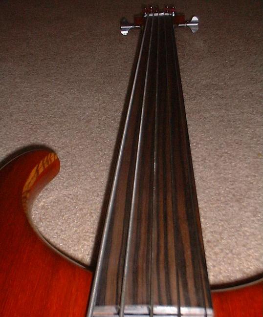Well, I hadn't imagined I'd ever let go of my custom Excel, but I just never finished my transition to playing fretless and it's a shame for this beast to sit in its case all the time. I'm mostly interested in trades rather than a straight sale, but nothing is set in stone. I'm really hoping to end up with a fretted Series I, and I hope I'm not crazy for thinking it would be a fair trade. Serial# 04X13385 - Fretless 5-string Excel Vermilion top Zebrawood accent lams w/purpleheart pinstripe Vermilion body Ebony/purpleheart/vermilion/mahogany neck Satin finish on back of neck Striped macassar ebony fingerboard Continuous vermilion veneers on pickups 34" scale Side LEDs: Green w/amber at 12th & 24th frets MXY neck pickup, FatBoy bridge pickup Europa/Rogue electronics w/custom layout Recessed straplocks Gotoh tuners Chrome plated hardware Strung BEADG with TI Jazz Flats Includes OHSC and wide amber leather strap w/embossed Alembic logo The condition is excellent, having only left my home once and only being played at home for perhaps a total of 12 hours. The finish seems to be lifting a bit in two spots - on the edge of the bottom straplock, and on the top edge of the tailpiece, hidden between the tailpiece and bridge. These are only noticeable upon close inspection; from a few feet away it looks simply impeccable. There is also a strange rattle or buzz that seems to be emanating from inside the neck when playing a couple particular positions on the G string, and I really haven't bothered to investigate it as I simply don't use this bass. I'd venture to guess it's one of the truss rods, and it's possible that a slight snugging of the truss rod nut(s) would take care of it, but I haven't tried. I make my own adjustments on my old beat-up Distillate, but I don't trust my non-expert hands to mess with the neck on this one. That being said, the rattle is minor and only appears on a couple notes in the higher range of the G string, so it hasn't been much of a bother to me. I just felt it should be mentioned here in the interest of full disclosure. The FTC thread is