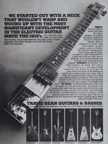 I like seeing how instrument makers build on traditions and innovation. I knew nothing about Travis Bean because they went out of business in 1979, and I started working in music stores after that era. I'm guessing that the people who own the 3,000 or so guitars they produced want to hang onto them. I think it's easy to see why: