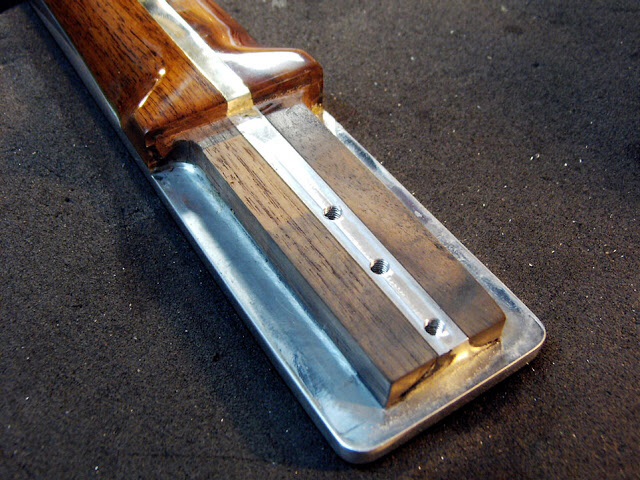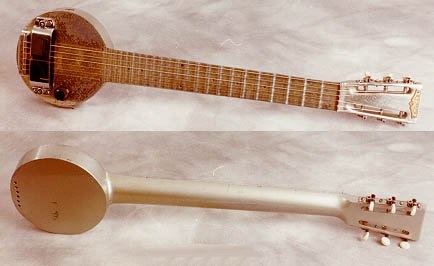 Even if it's to have in the trunk as an emergency oar, or to dig your car out of snowdrifts. Just kidding! I've been doing a lot of reading and looking at guitar porn, and man, those things were incredibly well-made. Even their cheapest line (the something-1000, I think) was made from koa. And the whole thing, from neck to tailpiece was one unit, milled out of a solid billet of aluminum. I love that he acknowledged (however obliquely) the pioneers who had come up with exactly the same thing in the 1930s, more or less: