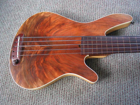 ASh body, Coco-bolo lined fretless fingerboard, Walnut neck, Clarowood top.