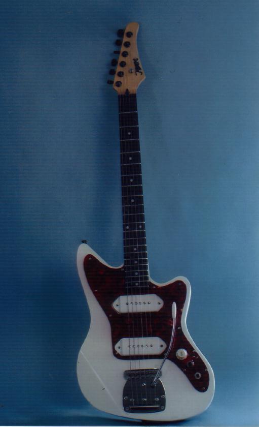 If it's the Fender construction, the wood that I used for the body (Alder in this case) or the vibrato, I can't tell but the Gibson P-90 pickups I fitted have a very convincing Jazzmaster tone. As soon as I strung it up and plugged it in, I turned up the Reverb of my amp and was playing all those Classics by the Ventures and the Shadows. I even had to spray paint the black dog ear pickup covers of those P-90's white, so they looked the part in the tortoise shell pickguard on that Vintage white body.