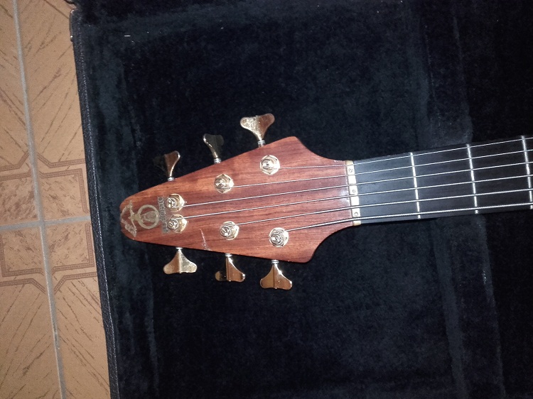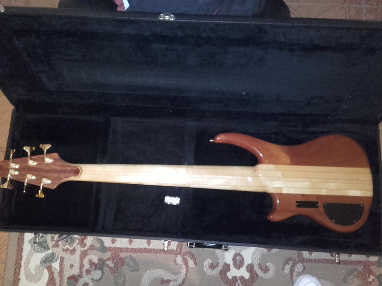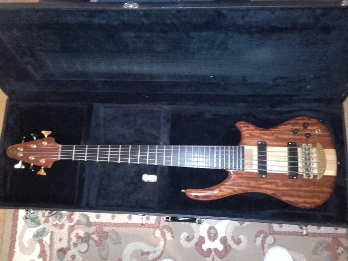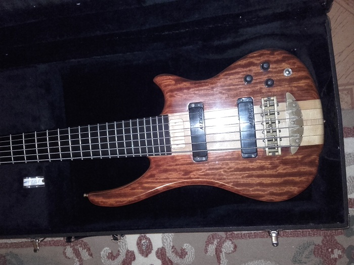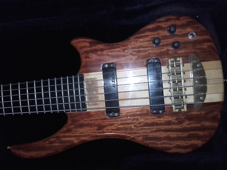 My latest acquisition - Alembic Essence 6-string No. 94 K 8399 - top: Bubinga accent: Maple pinstripe body: Mahogany neck: Maple with Walnut pinstripes, 34" long scale fingerboard: Ebony, no inlays pickups: MXY56 controls: volume, pan, filter, mono output birthday: June 17, 1994