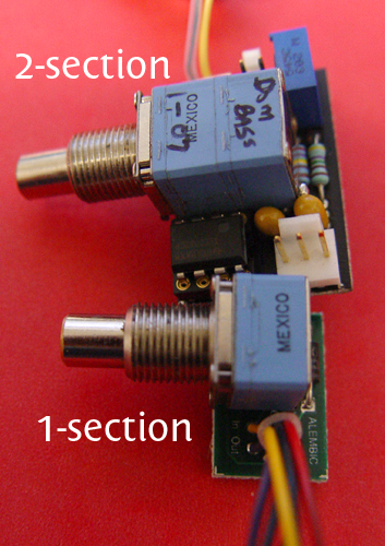 3. I don't understand this question; I don't understand what single section and two section mean.  Since you said the volume pots are single section and the filter pots are two section for reference, I opened up the back and stared at the electronics for a while.  But it's not clear what these terms mean to me.  I see some differences between the filters and the single (master) volume -but it seems to be the presence of the circuit boards and the little blue squares (the preamp adjusters, right?).  After looking again and again, it's not clear what two section means... it's not clear what is two section(s).  I will remind you that there is a picture of my electronics cavity on my COTM thread... it's a little small, but maybe you can tell by looking at it, since you know what you're looking for... or if you can give me more information so that I know what to look for, maybe then I'll be able to tell you.