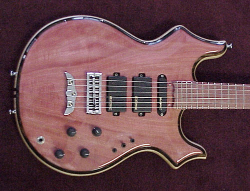 I dream of a Pink Ivroy fretboard with Black Mother of Pearl ovals on a Buckeye Burl JB shaped six with a Purple Heart & Ebony neck (six string with cone shape head)