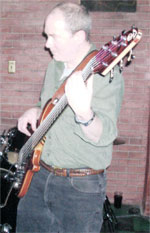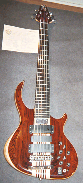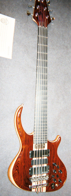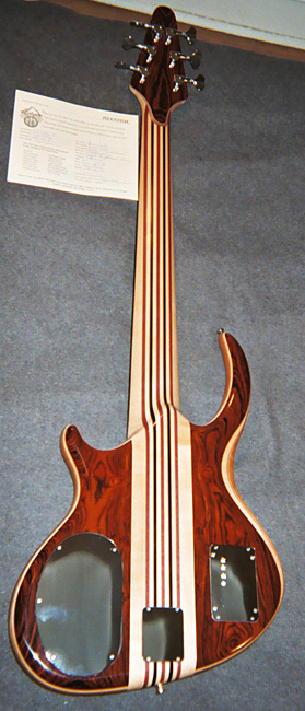 Commissioned?12/04 completed 12/05. Series I Six String, Series II Electronics, Rogue Body, Coco Bolo, Accent woods: Maple/Vermilion, Mahogany body, Custom Asymmetrical "Tobias neck feel", 34" Scale, Aluminum side position markers, strung with Ken Smith Taper Core Medium-6 28-44-63-84-106-130