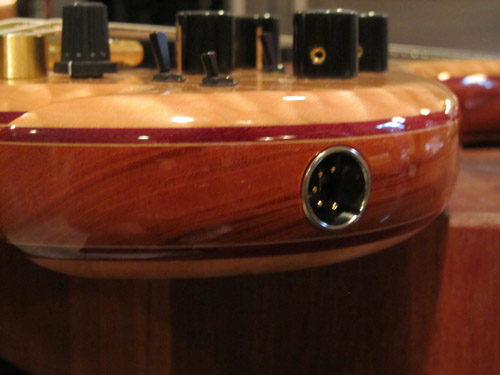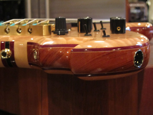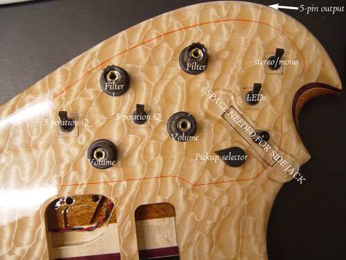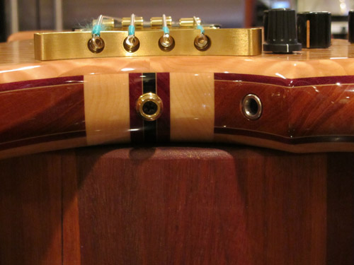 Flip's comment reminded me of another aspect of this bass which might interest the Club.  Because I switched to Anniversary electronics mid-production, it became a challenge to fit everything in the electronics cavity and keep the additional jack on the side.  I didn't want it on the top and "spoil" the view of the quilts.  Mica explored several options to fit the 1/4" jack (which is the longer of the two) and came up with the solution below, which initially seemed strange but works great in practice (thanks again, Mica).  I wanted both jacks because I often use a wireless when we play out, but the 5-pin works with my existing stereo setup for the Series II.