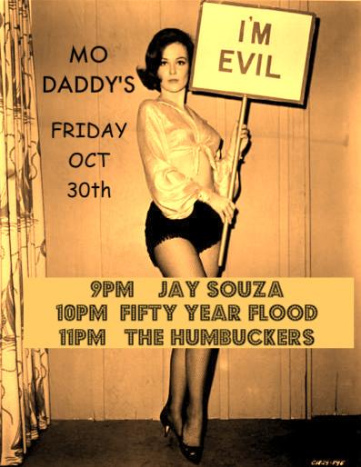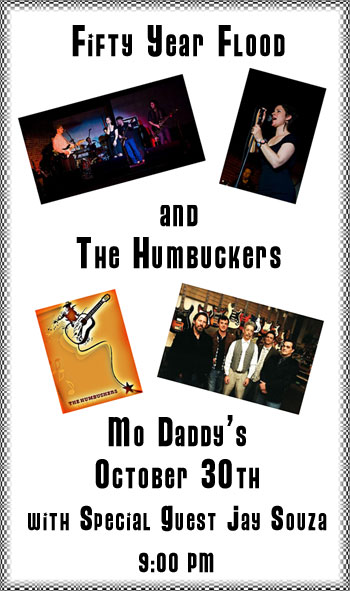 Friday, October 30, we're downtown at Mo Daddy's with Jay Souza of 50 Cent Haircut (Los Angeles Americana) opening the evening at around 9 PM and our good friends The Humbuckers will also be joining us!  This is going to be a great Halloween Eve party with The Flood and Friends!  All for the price of a latte ;)