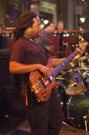 Here is my Alembic Europa 5, seen on stage with me holding on for dear life. It's a photo from the gig I did last night with my jazz-funk band at a small Jazz club. Jazzyvee
