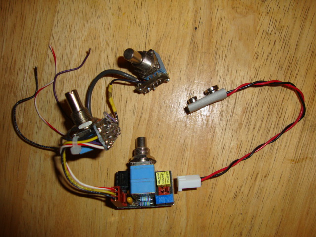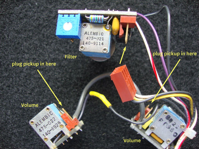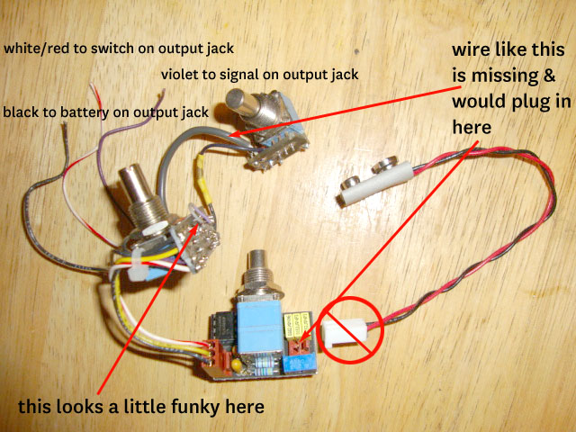 The battery clip is MUCH newer than the rest and doesn't plug in to the connector you have it next to. On this system, the battery clip would have been hardwired to the volume harness and output jack. The jack is a Switchcraft L113 and not a standard jack (it need to turn the battery on).