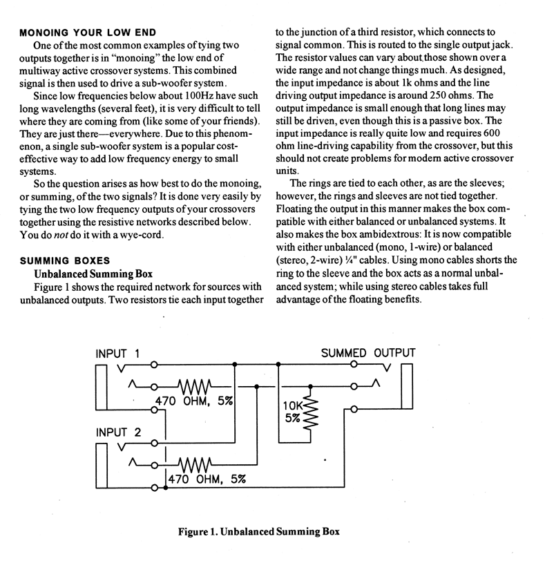 Todd, as a quick-and-dirty solution you could track down a passive splitter box, the kind of thing you would use to run one signal into two amps, and run it 'backwards' so you're feeding two signals into one 1/4 line. I think DOD made a box like that but I'm nowhere near sure.