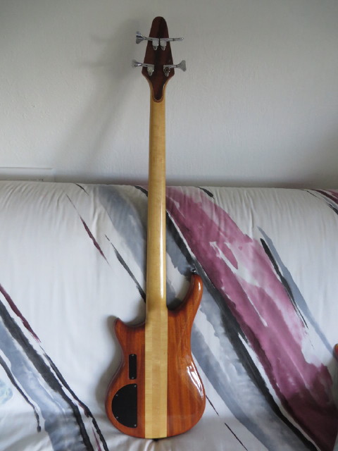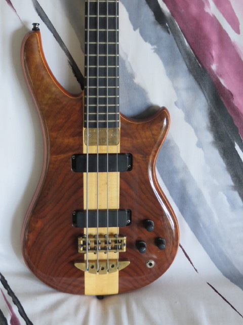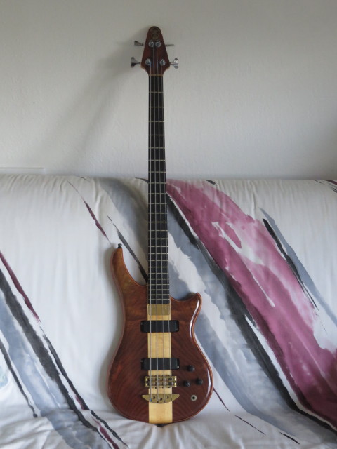 Here's the info: serial: 92K7055 name: Essence model: KLB4 top: Walnut accent: Maple pinstripe body: Mahogany shape: Essence neck: 3-piece Maple scale: 34" long fingerboard: Ebony inlays: none peghead: Cone pickups: Alembic MXY electronics: "Essence" volume, pan, filter, mono output finish: clear gloss backplates: plastic hardware: polished brass originally made for: WILS, the Netherlands birthday: February 19, 1992 Asking $2K + actual shipping costs. Comes with non-Alembic HSC that sort of fits, but does protect. Only issue is one of the "A's" on one of the tuners is missing. Bill, tgo