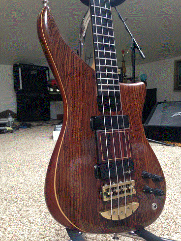 Ugly: The finish is dinged and scratched, with the worst being thumb wear between the pickups, and at the peak of the headstock. The overall finish quality is nothing catastrophic, but this bass could use a buffing and polishing. Second - the top has separated at the bookmatch, from a ~.002 on the bottom of the body to ~.050 at the neck. This does not have any perceived effect on the bass other than cosmetic; the neck joint is AMAZING with absolutely no threat of movement. I purchased the instrument in this condition (as did the previous owners), and if I were to keep it, I would probably leave it as it is. I considered routing the middle of the top and inlaying a .200 wide strip of highly flamed maple, but decided to go for the finger ramp project instead as it is easily reversible, beautiful and extremely functional!