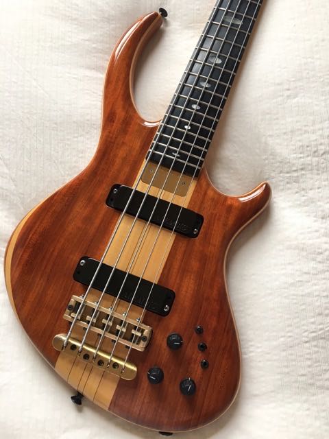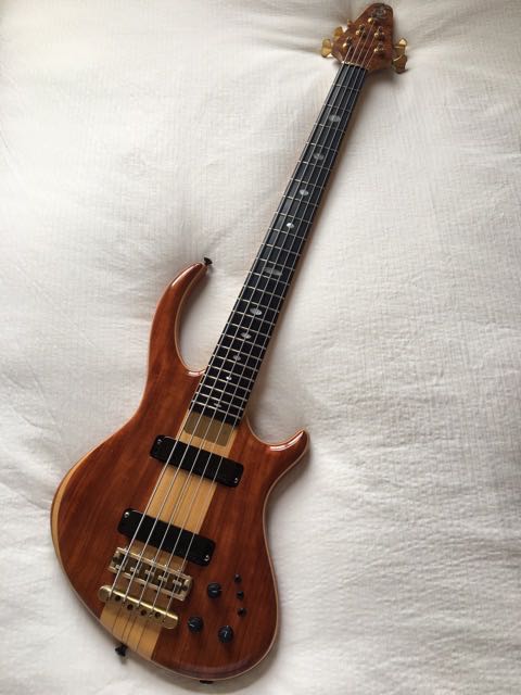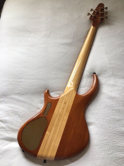 Some features of the bass: this Rogue was built in 1997. The top is Bubinga with mahogany body. It features an ebony fingerboard and has a 34 scale. The electronics are MXY56 (active). It weights 10.3 lbs on my scale.