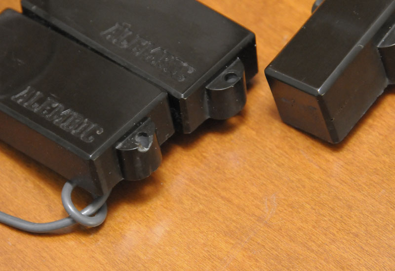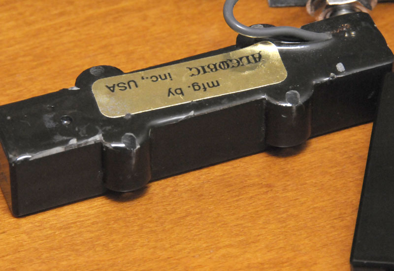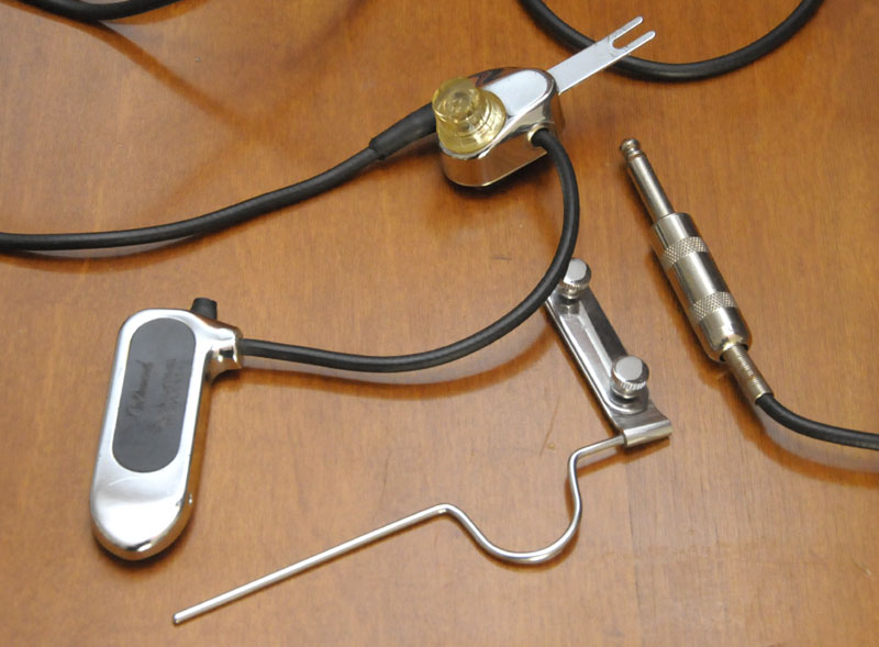 Alembic Jazz and Precision pickup and electronic set. It is a super upgrade for your bass. This setup was on a bass that I no longer have, and I can tell you it sounded great. You get the best of both worlds this way, like combining two Fender bass styles into one bass. You will need to provide your own screws for the pickups. The jazz bass pickup has 2 small cracks at the bottom of two of the mountings and the P bass pickup has a tiny chip from the top of one mounting. None of this affects the mounting of the pickups. I tried to show the defects in the photos. $400 plus shipping I also have a vintage DeArmond monkey on a stick pickup that I am selling. I think it is for a mandolin or banjo, since the pickup is 2 3/4 inches wide. I get a 6.38 ohm reading on it from my VOM meter. It has a nice long cord and the knob moves smoothly. The chrome is nice and shiny. $125 plus shipping