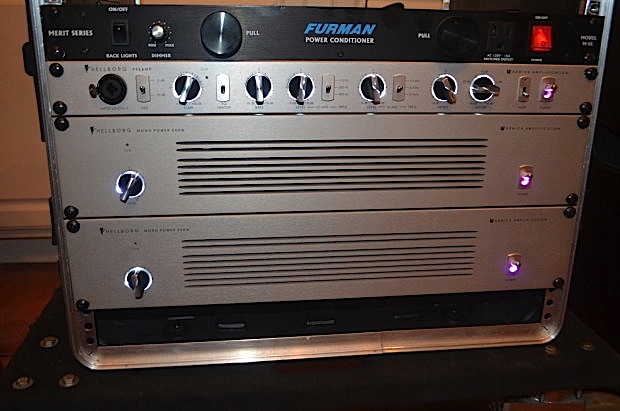 Never gigged, only played in the bedroom. You get one Warwick Jonas Hellborg Signature Preamp.  Two, (Yes!) 2 Jonas Hellborg Power amp.  Two Jonas Hellborg 2x12" Hi Cab speaker cabinets.  All for a great price!  This rig sounds amazing and will fill any room with earth shaking, clean, clear bass, perfect for amplifying Alembic basses.  Selling price includes shipping. Comes with original paperwork and boxes for the Preamp and Power amps.                             **$7000 or Best Reasonable Offer. **  Preamp Details: The Hellborg Preamp delivers extreme headroom. That means absolutely minimal noise and a capacity to deal with transients and peaks like no other bass amp before. It is designed with the quality and circuitry solutions found in the greatest recording consoles. In fact the transformer balanced DI out, although normally used to feed the signal to a PA system, is designed as direct to tape or disc recording output. There are both high and low impedance inputs provided through a combo- ?" (high impedance)/XLR (low impedance) jack. The EQ section provides shelving EQ for high (15kHz) and low band (40Hz) and an inductive (coil based) EQ for the mids with stepped (fixed) frequency and continuously variable gain. Choices of frequencies are as follows: 110, 300 and 800Hz for low mids, 1.5, 3 and 5 kHz for high mids. All transformers and coils are optimally shielded in MU-metal housing. Whether passive or active the Hellborg Preamp will make your bass sound better. ?   Input: Neutrik "combo" jack (1/4" and XLR) ?   Clip Indicator: Green (correct operation level); Red (clipping) ?   Input Gain: 66 dB ?   Input Impedance: 50k Ohm; XLR 600 Ohm ?   EQ Bass: 60 Hz, /-18dB ?   EQ Lo-Mid: 110 Hz, 300 Hz or 800 Hz (selectable), /- 15dB ?   EQ Hi-Mid: 1-5 kHz, 3kHz or 5 kHz (selectable), /- 15 dB ?   EQ Treble: 10 kHz, /- 18 dB ?   DI Output: XLR transformer balanced (0 dB, 600 Ohms) ?   Tuner Output: 0dB ?   Line Output: 2x 6dB  Amp Details: ?   The Mono Power 500 was developed primarily to drive the Big Cab which requires a lot of power to sound its best. It adds an extra dimension of depth and dynamics to all the other cabinets as well but you must be careful since it is capable of peaks quite a bit above its rated output. The Hellborg Mono Power 500 has an output of 500 watts, the output impedance is selectable (2, 4 or 8Ω). Amp Details: ?   Power Requirement: 230 / 115 V ?   Technology: Bipolar Power Amp with Speaker Output transformer ?   Power Output: 500 watts ?   Input: 0dB ?   Output: 0" and lockable Coaxial Speaker Connection ?   Controls / Switches: Level with clip LED); Power (On/Off); Voltage Selector (115/230V); Ground / Lift; Output Impedance: 2,4 or 8 Ohms ?   Weight: 41,9 lb (19kg) ?   Dimensions (W/H/D):  19" / 2RU / 15,6" (370mm)  Speaker Details: The Hi Cab was created to compete with loud guitars. It will give the clarity, presence and the full sound that you need competing with a noisy musical environment. The Hi Cab can be combined with the Big Cab or the Lo Cab to make an impressive bass stack. It is loaded with two Celestion 12-inch full range speakers. Type2x12 bass reflex cabinet  Frequency Range50Hz - 8kHz  Power Rating200 watts RMS  Peak400 watts  Impedance4 ohms  Sensitivity100dB SPL @ 1w/1m  Speaker2 x Celestion 12" full range speakers  Dimensions (H x W x D) 26.5" x 21" x 15"  Weight53lb