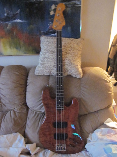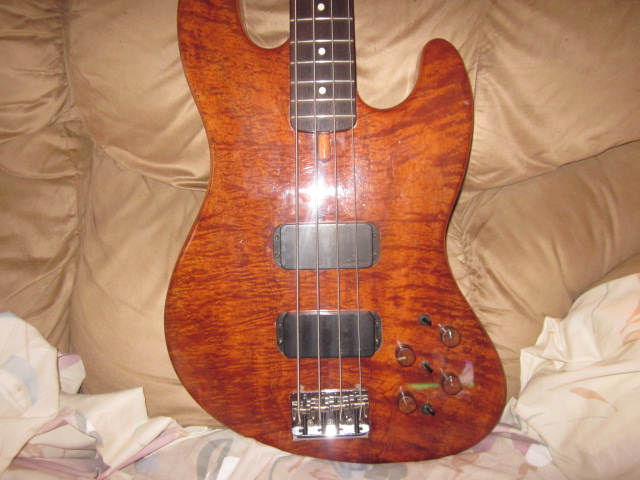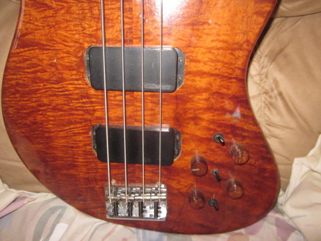 I thought I would also post this for those interested. It's a chambered Warmoth Mahogany body with a Flame Koa Top. Axy in the front, Fatboy in the back. It's got a well made Japanese Fender Vintage Neck. Two volumes, two q's and a stereo mono Q with two low pass filters. The amount of tone variability is phenomenal. From deep dub to jaco. Make a reasonable offer.