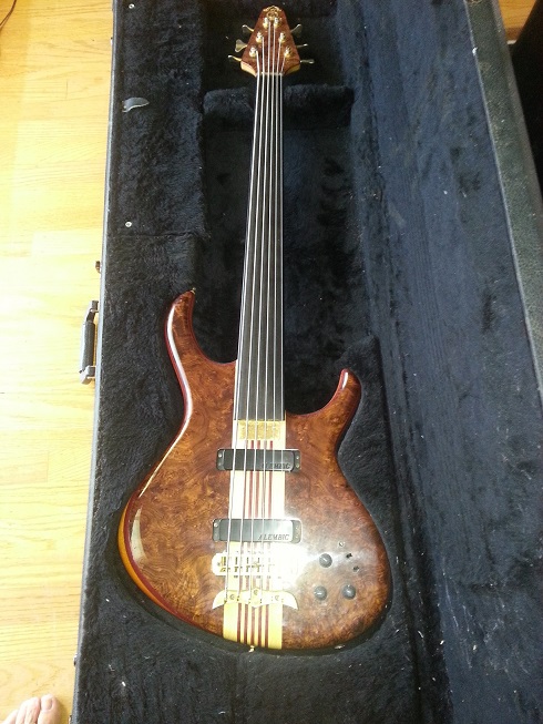 '95 6-string Europa bass, Burl Brazilian Rosewood top, Purpleheart accent laminate, mahogany body, Bulger body shape, 11-piece Maple and Purpleheart 34 scale neck, Fretless Ebony fingerboard, 2.00 x 3.125 classic taper, Cone peghead shape, Gold plated hardware. Electronics: Europa.