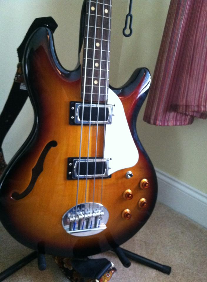 It's 3 tone sunburst finish, mahogany body with maple top, maple neck, rosewood fingerboard, Chi-Sonic pickups, 2 volumes, 2 tones, pickup selector, 34 scale. Here's what makes it really one of a kind, the original owner ordered it FROM THE FACTORY with a white pickguard and pearloid truss rod cover, this is the ONLY Lakland hollow body with a pickguard! They also installed a Hipshot D-tuner but included the original tuner as well, also has a hardshell case in great condition.