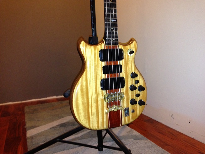 The wood choice, layout and execution on the 4 string is amazing. The carve on the guitar top is also very well done. Two of the nicest Alembics ever made.