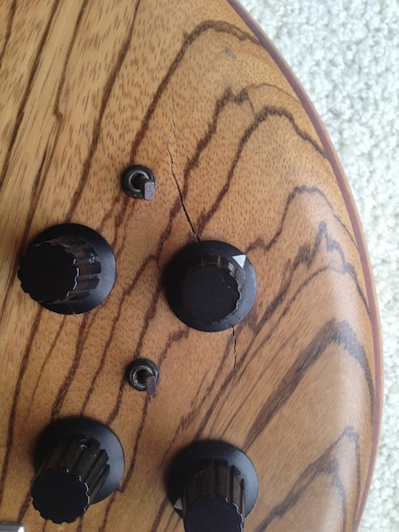 It appears at one point the neck pickup Q control knob came in contact with something and resulted in this crack. I had a local luthier tell me it wouldn't be difficult to repair, but I left it the way it was. The Q control toggle switch also was bent, but everything still works fine. There is a chrome switch below the 1/4 jack that works as a stereo/mono control.