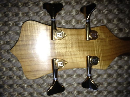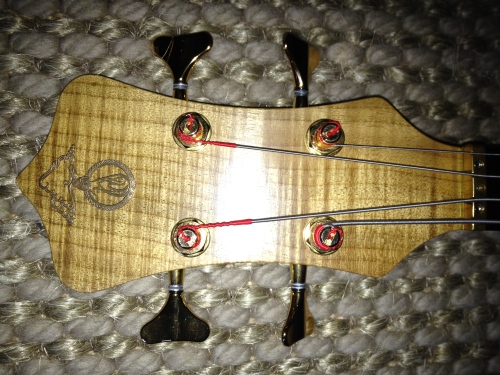 The bass was built in '11, he bought it brand new last year from Bass Central for $7899, if you check, it's still listed as sold. Also you'll find details about neck size... There is a small ding on the very top of the headstock as you can see, boy that must have hurt as it happened!!! Asking price is $4200 shipped ConUS. PayPal OK but fee free. If you have questions I'll turn them to him and let you know. I had problems posting pictures so, with the help of our great moderator Dave, hopefully I'll be able to show this beautiful art work, so stay tuned.
