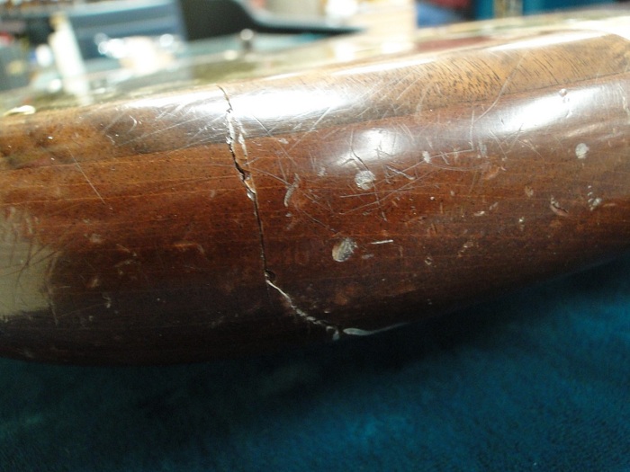 also this bass has some worn spots in finish and on brass, a serious crack in the body on the bottomside and  some impressions on body and neck, they did not mention the neck joint repair.