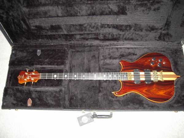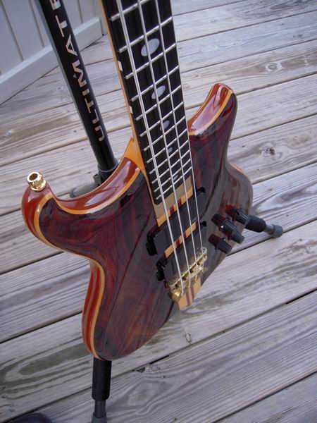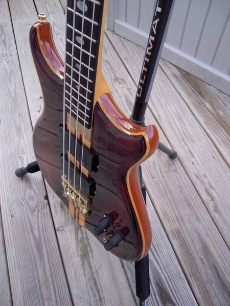This 1991 Mark King Delux is up for trade. I am looking for a Stanley model with light wood (flame, birds eye, quilted maple etc). Although prefered, the electronics do not have to be Signature Electronics.   Specs on the MK are; Coco-bolo front and back, 5-piece neck, Gold colored tuning pegs, brass logo, brass hardward, signature electronics but NOT stereo (Volume, Pan, 2-tone, 2-Q switeches) SN: 91MK6693. I do not have the wood card for this bass. When I bought it new at Chuck Levin's they said that they lost it.  Here are a few pix. This bass has no nicks, dings, scratches or checking. It is in near perfect condition. If I can find a flaw, I'll do my best to photograph it and post it.  I am not interested in selling this bass, only trading it for a Stanley.  Thanks for looking, STONEY