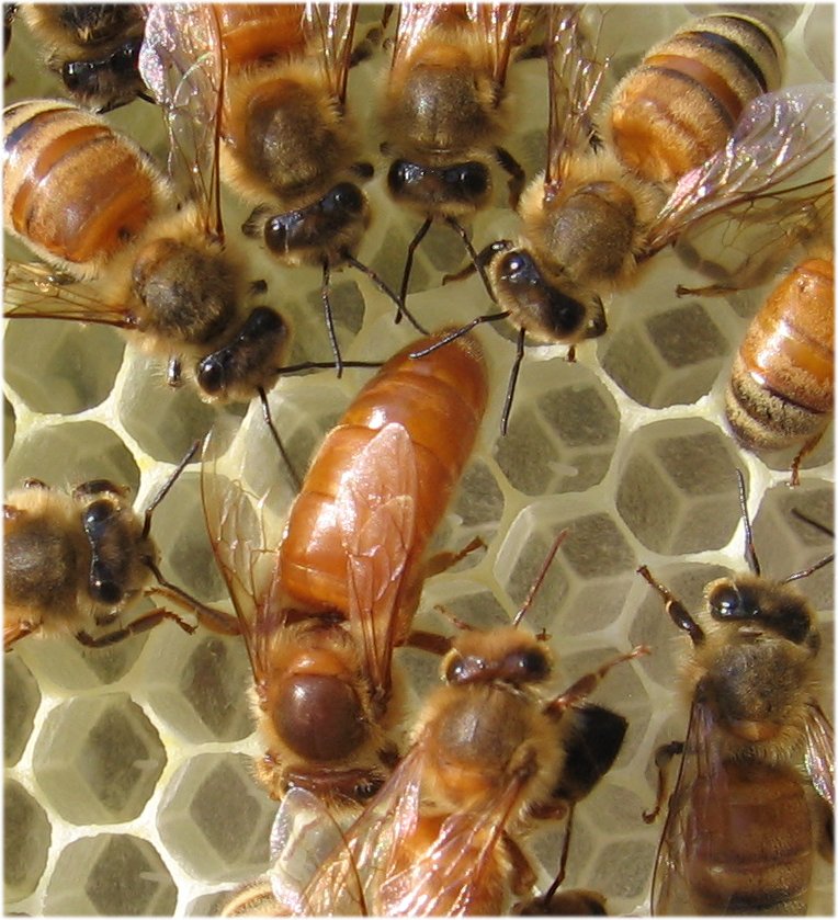 One of our queens caught in the act of laying eggs (note the eggs in adjacent cells - they look like a grain of rice)