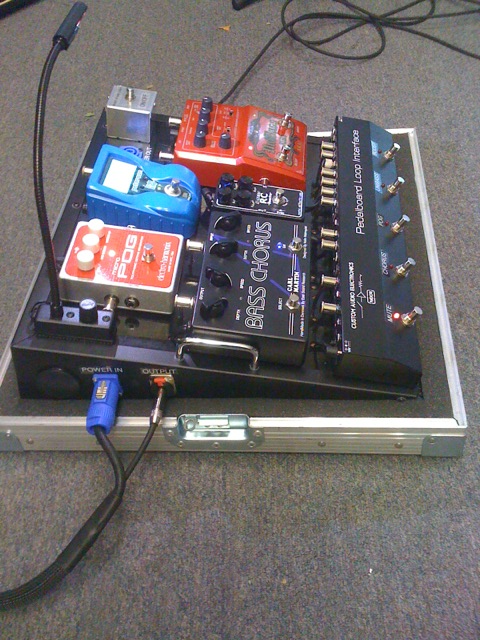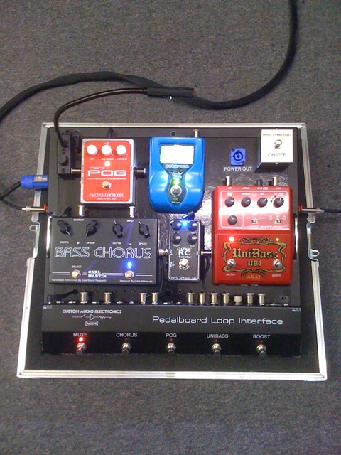 Selling my pedalboard: Trailer Trash board w/road case  Custom Audio Electronics/MXR Pedalboard Loop Interface  Xotic Bass RC Booster  Akai Unibass  Electro Harmonix MicroPog  Carl Martin Bass Chorus  Peterson Strobostomp  Aux power output for music stand light w/footswitch  Littlite gooseneck light  Custom power and output line cable  Digital Music Corp Pedal Power II(under pedalboard)  Asking $1200.00 shipped 2nd Day Air anywhere in the lowere 48 states!  For more details call me at 831-521-7749