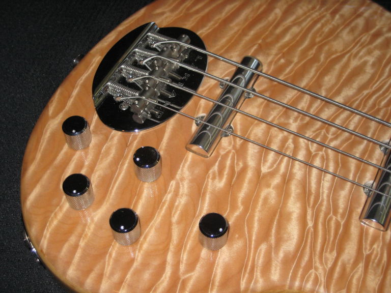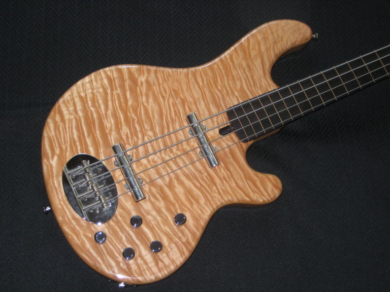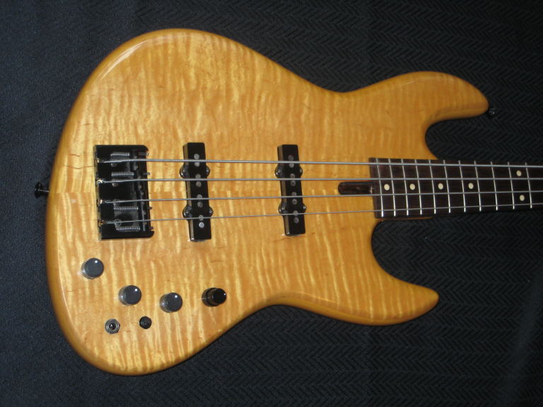 1) Fodera NYC Empire 4, probably built in the 1990s. Ash body, quilted maple top, rosewood board, upgraded to newer Pope preamp. Comes with SKB case. Good condition: there is a cigarette burn on the headstock, and some crackling of the finish by the neck joint on the back, but no structural issues whatsoever. Currently on ebay with a Buy-it-Now of $2200.