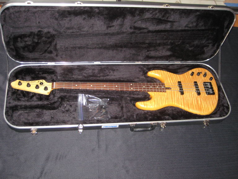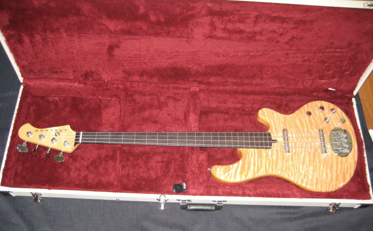 2) Lakland USA Scheff Fretless 4. Previously owned by Dan Lakin. I'm the third owner. Excellent craftsmanship, killer fretless single-coil sound. Quilted maple top on ash body, lined ebony fingerboard. Comes with Lakland deluxe hardshell case. Excellent condition: just one small ding in the finish on the top. $2200.